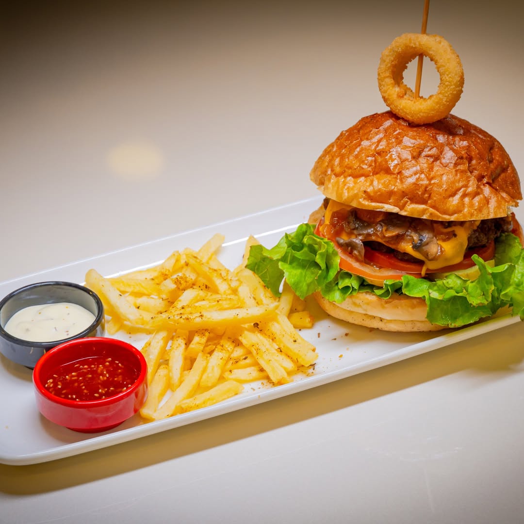 İçindekiler:(Burger Köftesi 120 gr. Domates, Marul, Salatalık Turşusu, Dip Sos, Cheddar Peyniri,Karamelize Mantar-Soğan