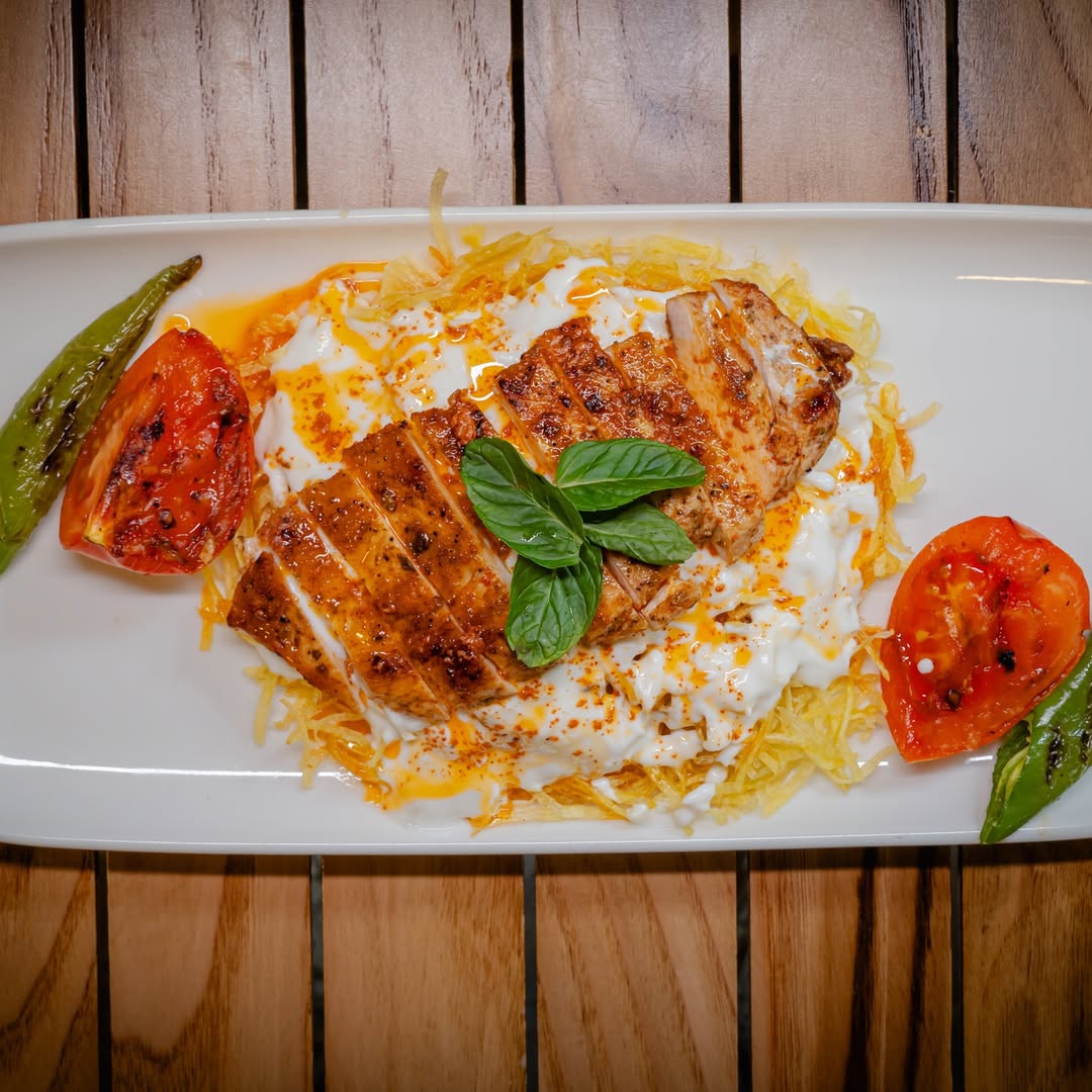 İçindekiler:(Julyen Izgara Tavuk (230 gr.) Kibrit Patates, Yoğurt, Sos, Tereyağı, Izgara Domates-Biber)