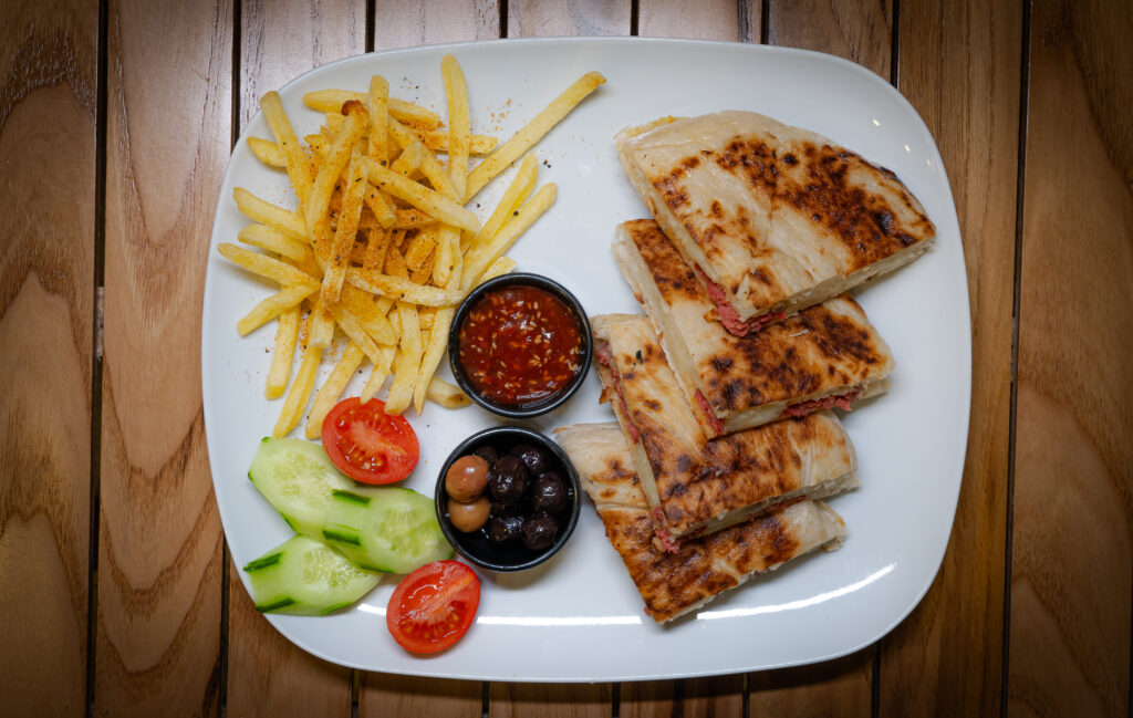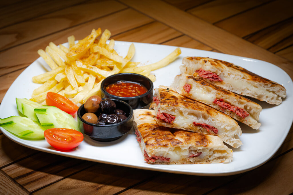 Kavurmalı Kaşarlı Tost İçindekiler:*Bazlamalarımız Büyük Boydur. Domates,salatalık, patates kızartması ve zeytin eşliğinde servis edilir. Fiyat:280 ₺